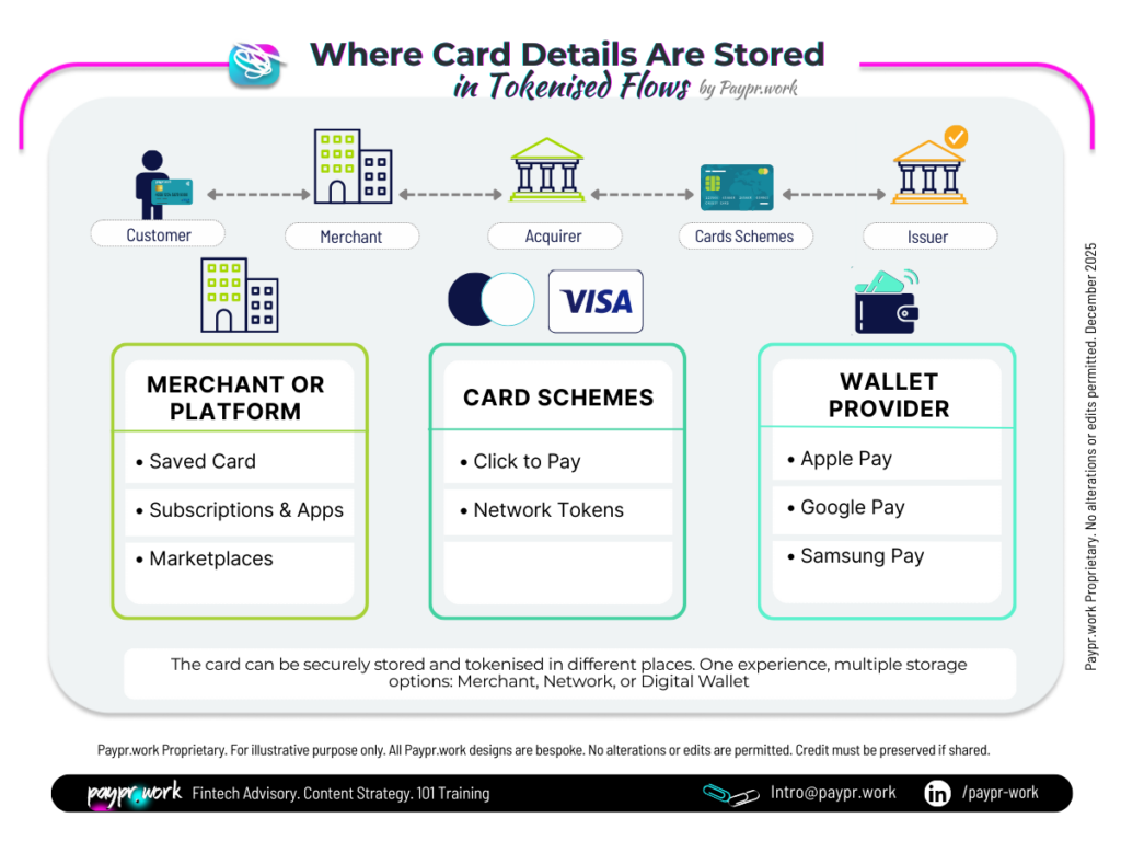 When a transaction is completed without keying in the full card number, it means the card is already stored somewhere in tokenised form. A token is a safe digital version of a card number. Instead of storing or sharing the real card details, more payments are now processed using tokens. Roughly speaking, there are 3 main places where that can happen.